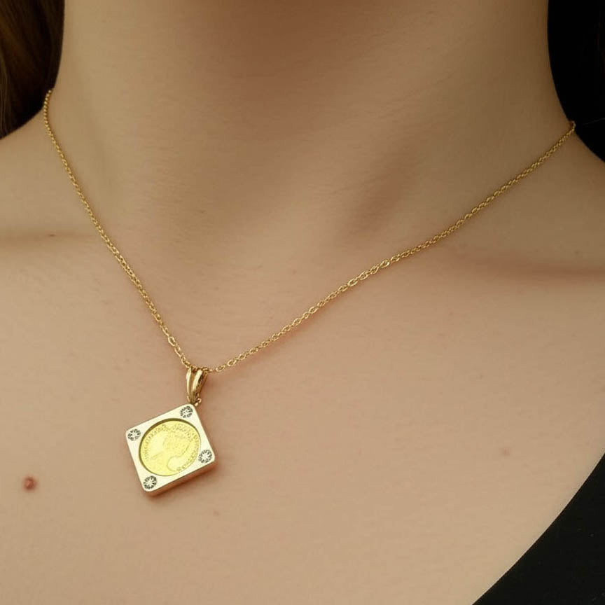This elegant necklace features a polished 14K yellow gold chain from which hangs a square-shaped pendant. The pendant showcases a gold coin, likely a sovereign or similar commemorative coin, set within a bezel. Each corner of the square pendant is accented with a sparkling round-cut stones, adding a touch of brilliance to the piece.