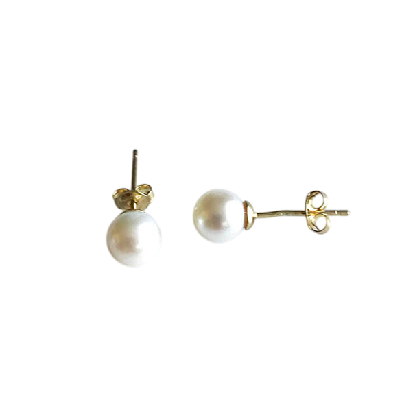 These elegant stud earrings feature lustrous cultured white pearls set in 14K gold. A timeless addition to any jewelry collection, perfect for everyday wear or special occasions.