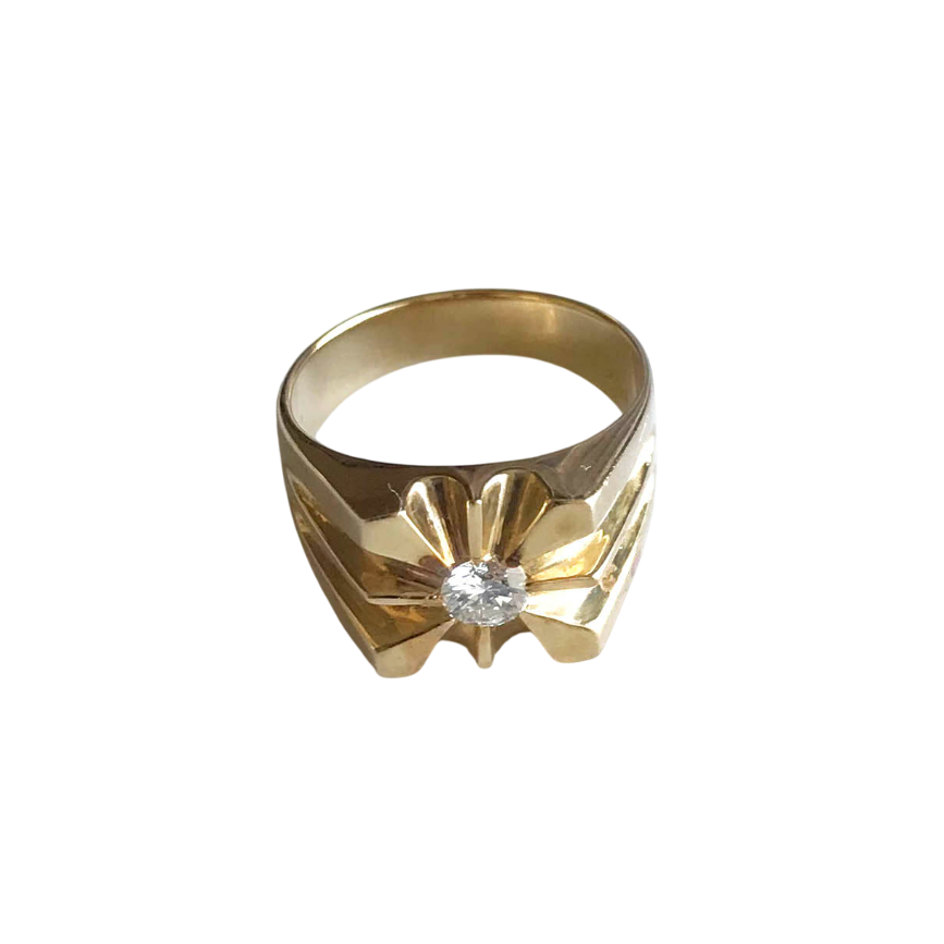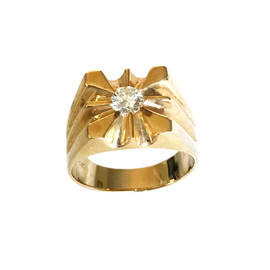 This is a unisex striking ring crafted from 14K yellow gold, featuring a brilliant round diamond solitaire at its center. The diamond is set within a captivating "sunburst" or "starburst" design, where the gold around it radiates outwards, creating a bold and distinctive look. The wide band has a polished finish, adding to its robust and classic appeal.