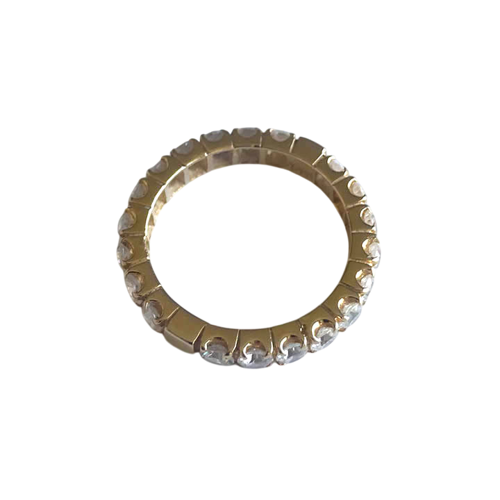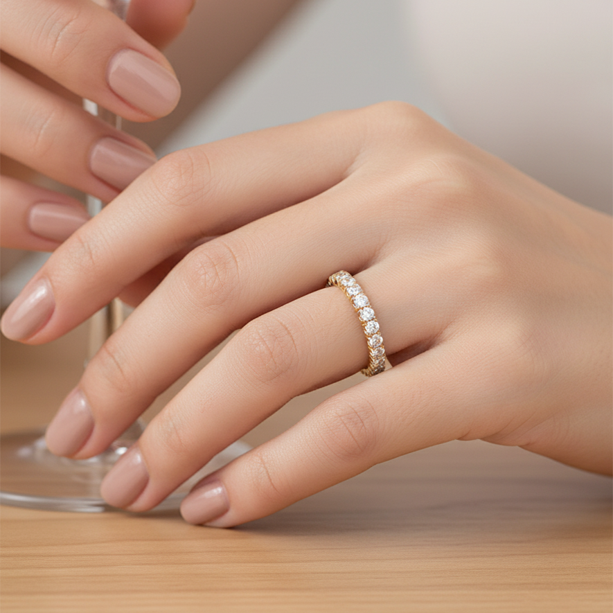 This elegant 14K gold eternity band features a continuous circle of sparkling stones, perfect for celebrating enduring love or adding a touch of timeless sophistication to any ensemble.