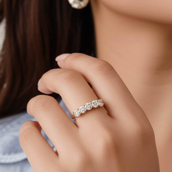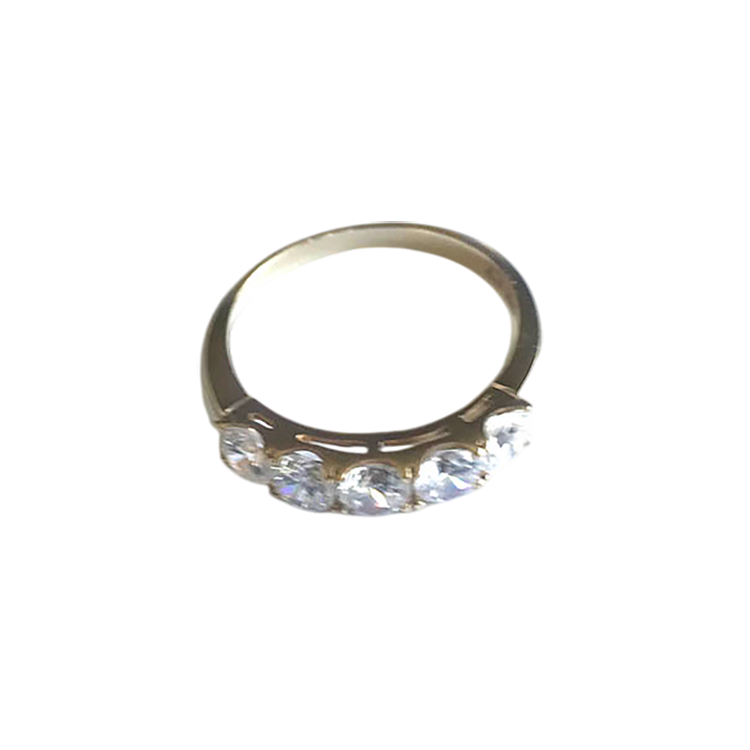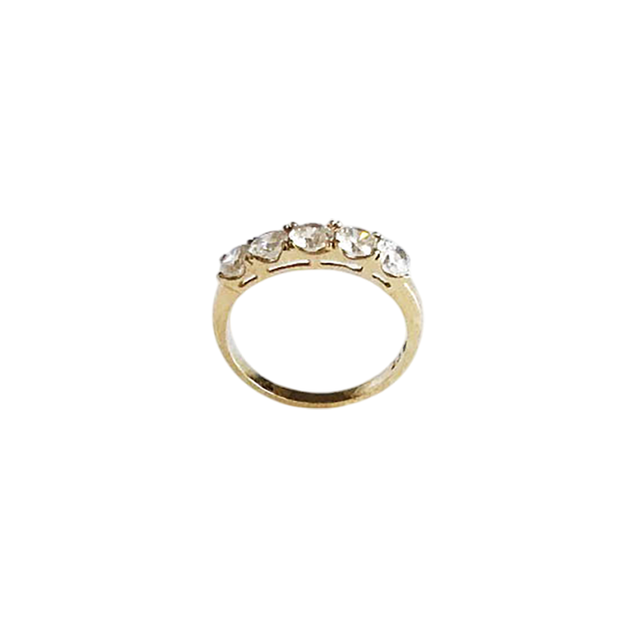 This elegant 14K yellow gold band ring features five brilliant-cut premium cubic Zirconia stones securely set across the top. The classic design makes it a versatile piece, perfect as a wedding band, anniversary ring, or a stylish addition to any jewelry collection.