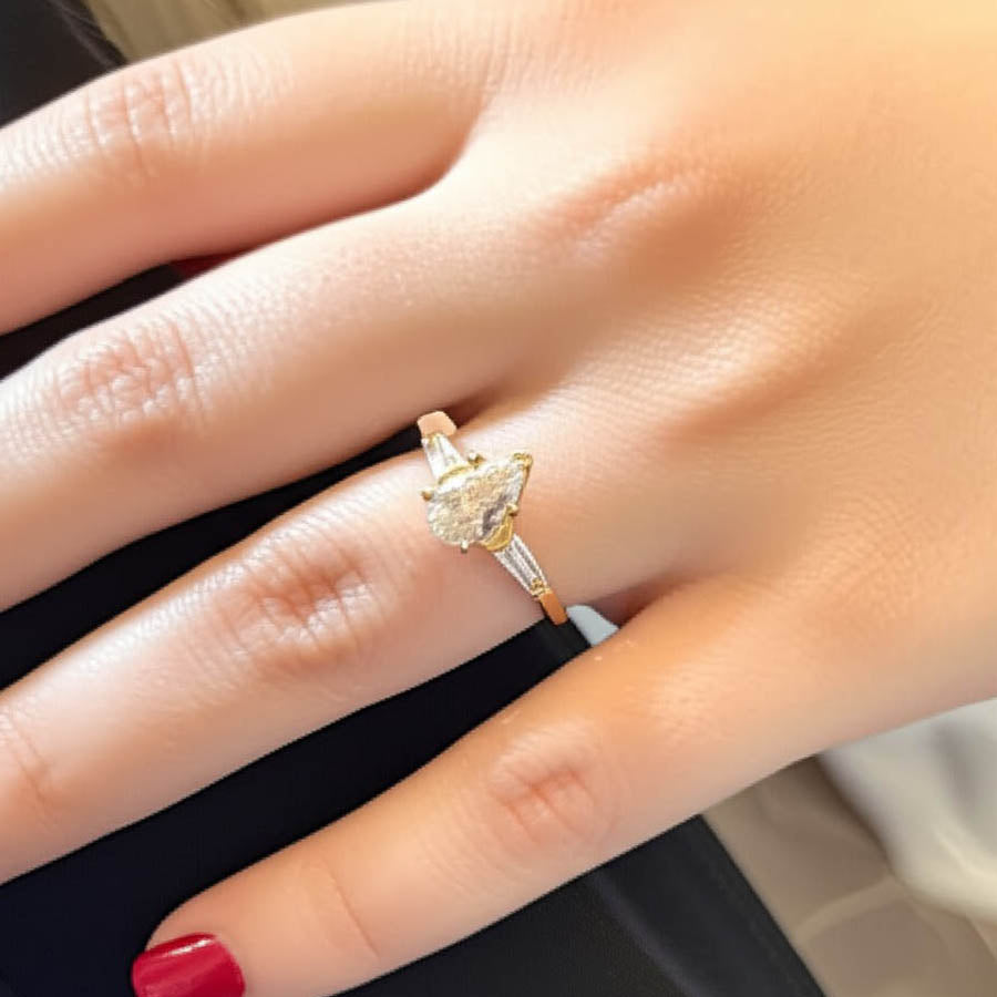 This elegant 14K gold ring features a brilliant pear-cut stone as its captivating center stone, flanked by two sophisticated tapered baguette stones. Its classic three-stone design offers timeless beauty and sparkle.