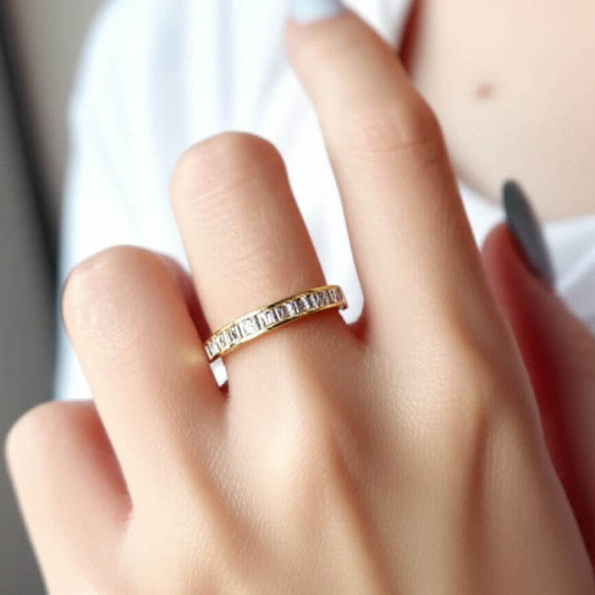 It's a classic and elegant ring featuring numerous princess-cut diamonds set continuously around the entire circumference of the 14-karat gold band. The princess cut gives the diamonds a modern, square shape, and the eternity style symbolizes everlasting love or commitment.