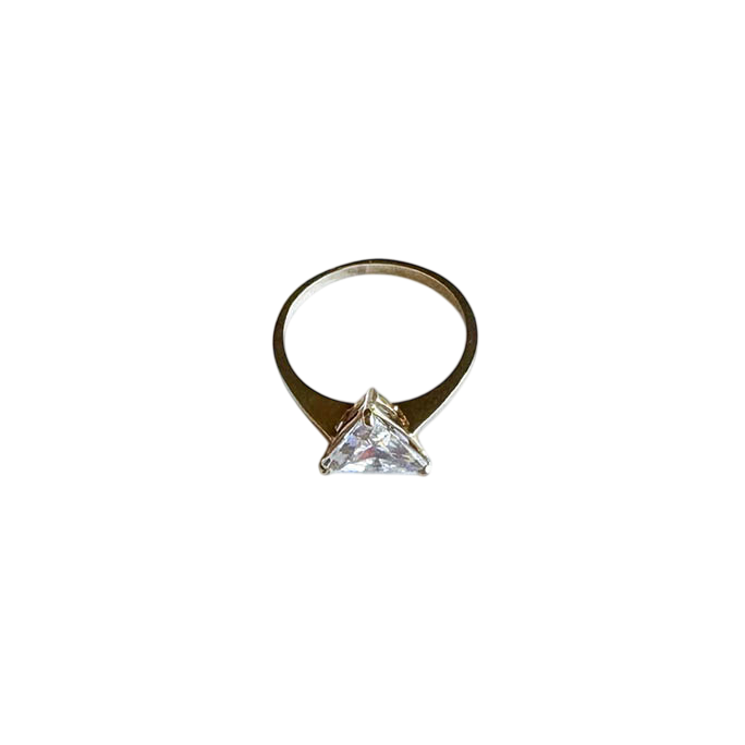 This elegant ring features a striking trillion-cut clear premium cubic zirconia set in high-quality 14K gold. The triangular stone is held securely in a classic three-prong solitaire setting, which maximizes light exposure for exceptional brilliance and fire. With its sharp, geometric silhouette and slim, polished gold band, this piece offers a modern, architectural take on the traditional solitaire. Its minimalist yet bold design makes it a versatile choice, perfect as a unique engagement ring or a sophisticated everyday statement piece.