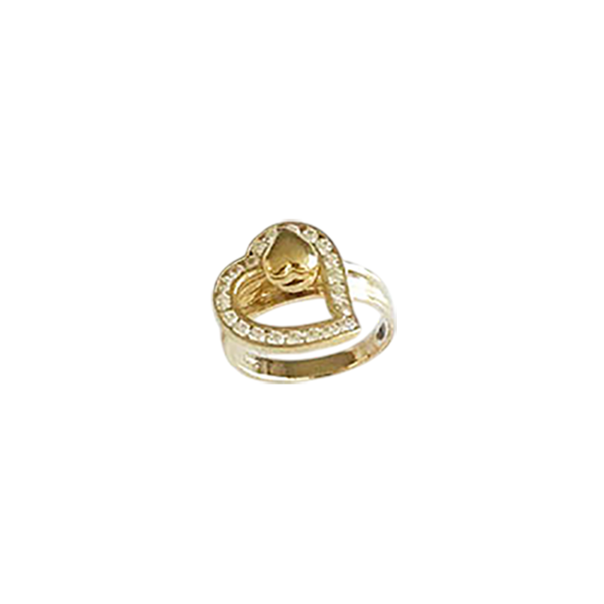 This exquisite 14k yellow gold ring features a captivating double-heart design. The outer heart is elegantly adorned with a pave setting of small, sparkling stones, adding a brilliant shimmer to the piece. Nestled within this stones-encrusted outline is a smaller, polished gold heart, creating a lovely contrast and a sense of depth. The band of the ring appears to be a classic, polished gold, complementing the ornate top. This ring would make a perfect gift for a loved one or a beautiful addition to any jewelry collection.