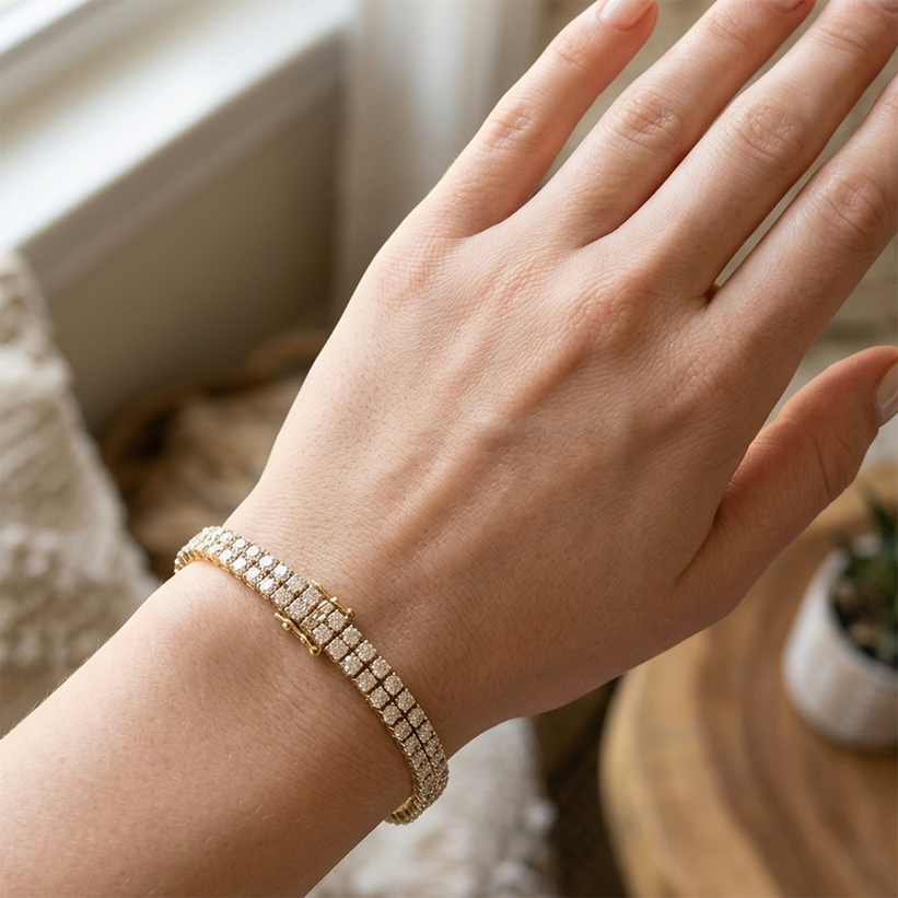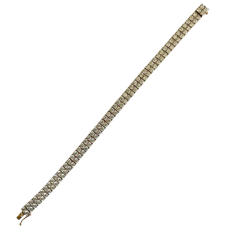 Elevate your collection with this stunning 14K yellow gold tennis bracelet, featuring a sophisticated double-row design. Meticulously crafted, the bracelet showcases two parallel lines of brilliant round-cut premium cubic zirconia, each held in a secure prong setting to maximize light reflection and sparkle.