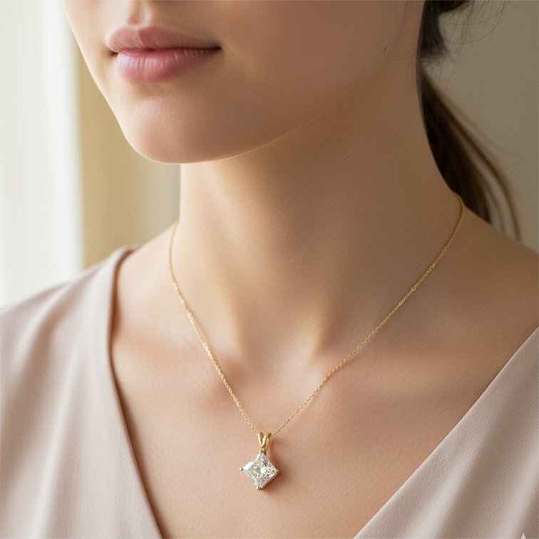 Add a touch of modern elegance to your jewelry collection with this stunning 14K gold solitaire pendant. Featuring a classic princess-cut premium cubic zirconia set in a unique "kite" orientation, this piece offers a contemporary twist on a timeless design.