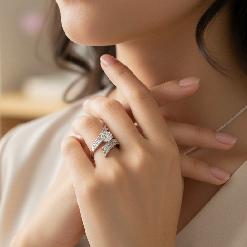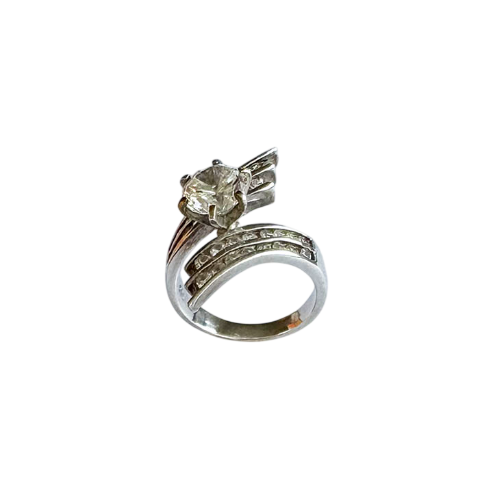This striking sterling silver ring features a modern, asymmetrical bypass design that balances bold architectural lines with elegant sparkle. At its heart is a brilliant, large round-cut center premium cubic zirconia held in a secure prong setting.
