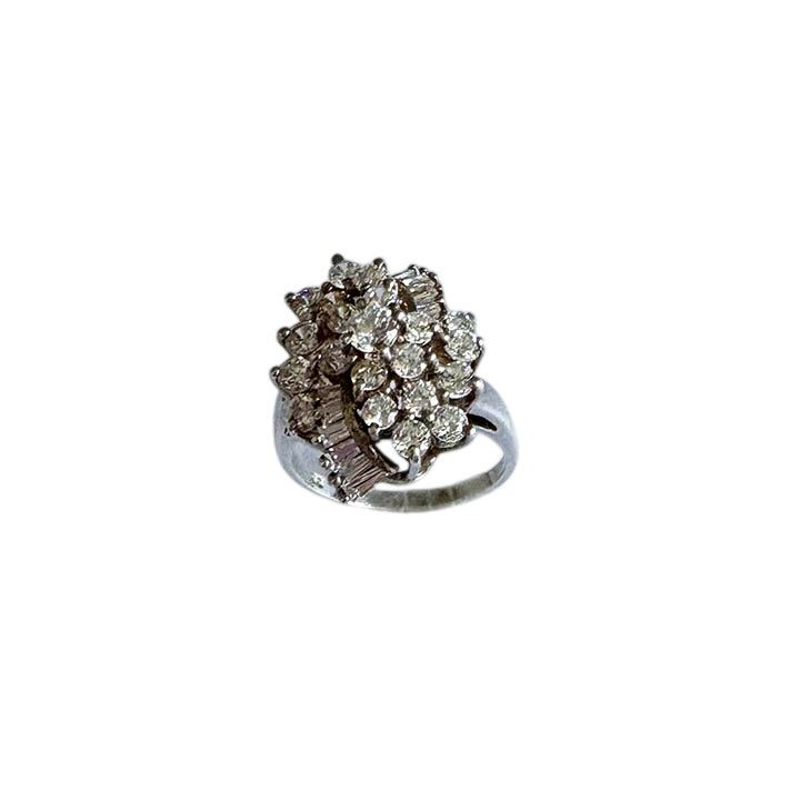 The combination of different stone shapes creates a classic Retro-era aesthetic, reminiscent of mid-century glamour. The ring's substantial "statement" silhouette and brilliant white stones make it an eye-catching piece for special occasions or a bold everyday look.
