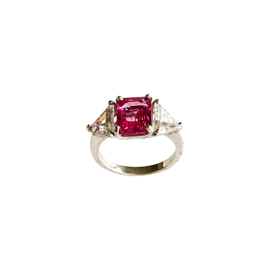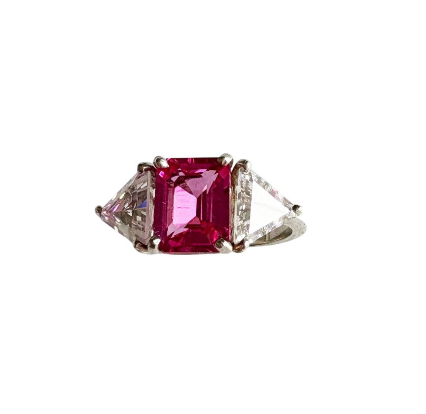 This captivating sterling silver ring features a vibrant, emerald-cut magenta gemstone as its stunning centerpiece. Flanked on either side by brilliant trillion-cut clear lap created color stone the design creates a sophisticated and eye-catching sparkle. The polished sterling silver band provides a classic and durable setting, making this ring a perfect statement piece for any occasion.