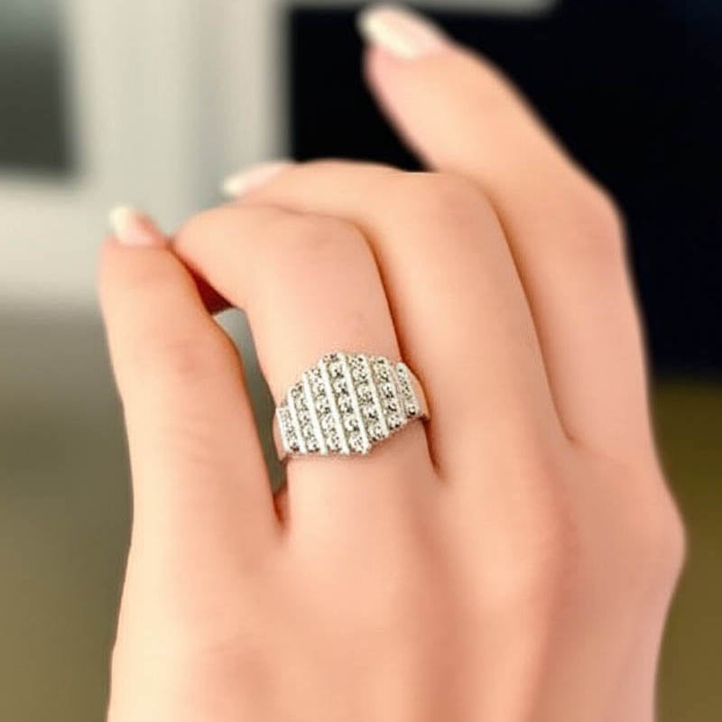 This elegant sterling silver ring features a unique ribbed dome design, meticulously adorned with pave-set stones across its surface. The sparkling stones are set in multiple rows along the raised ribs, creating a brilliant and sophisticated look. This piece is perfect for adding a touch of glamour to any outfit and makes a wonderful gift for any occasion.