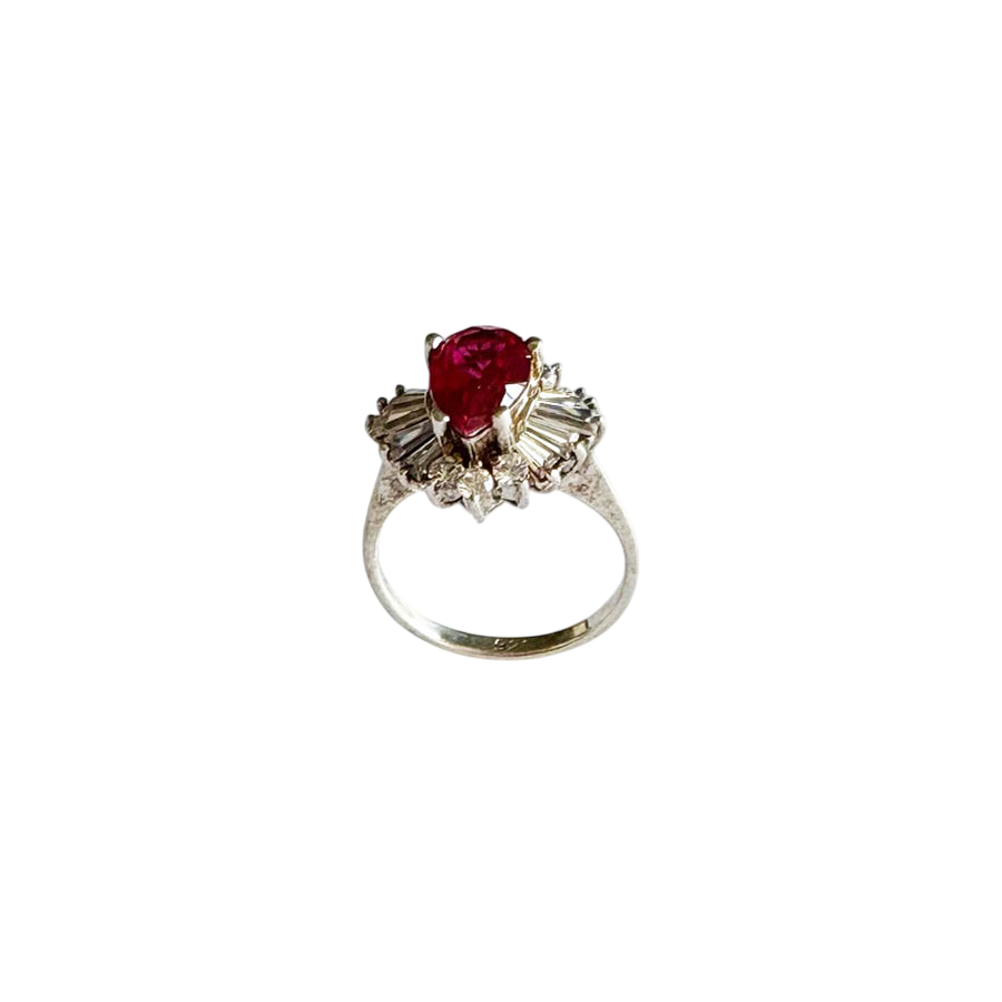 This elegant sterling silver ring features a prominent pear-cut lap created red stone as its center stone, exuding a vibrant red hue. The ruby is surrounded by a dazzling halo of baguette and round-cut cubic zirconia, set in a radial, fanned design, enhancing its brilliance. The band is crafted from sterling silver, complementing the sparkling color stone. This piece makes a stunning statement as a cocktail ring or a special occasion accessory.
