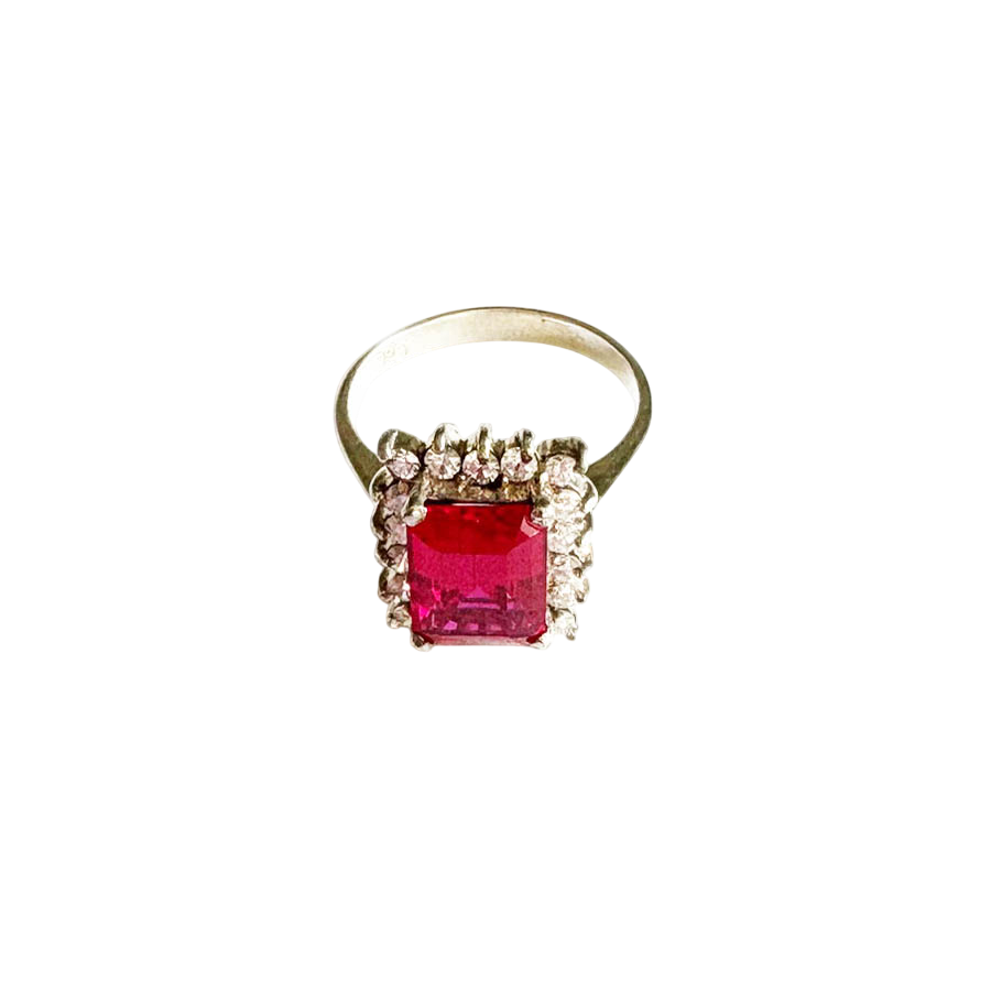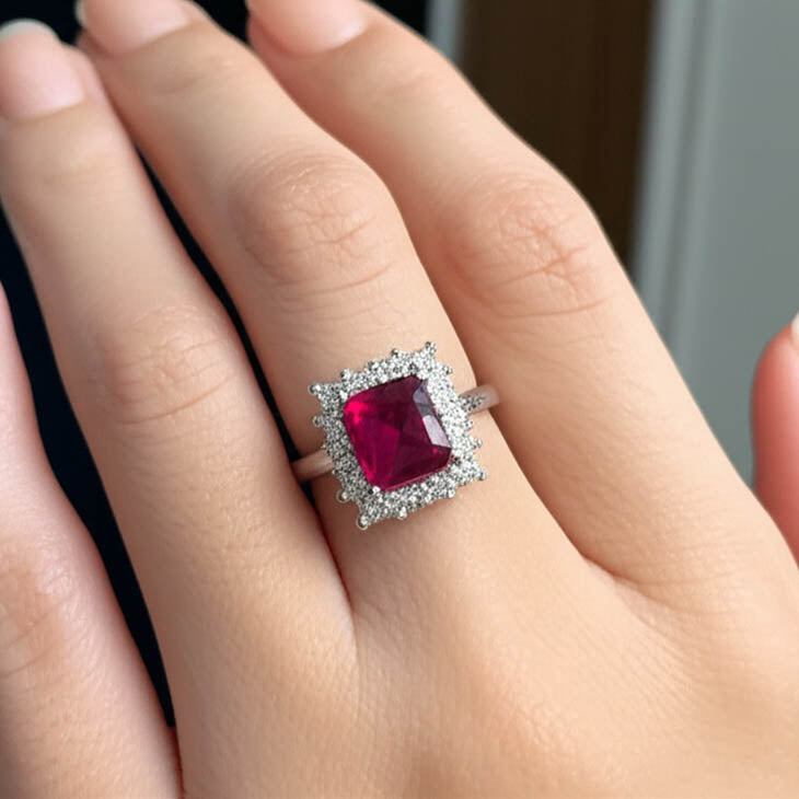 This elegant sterling silver ring features a striking square-cut, vibrant ruby red cubic zirconia as its centerpiece. The central stone is beautifully framed by a halo of smaller, sparkling white cubic zirconia stones, creating a dazzling cluster design. The polished sterling silver band complements the radiant stones, making this ring a perfect statement piece for any occasion or a thoughtful gift.