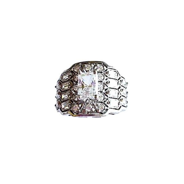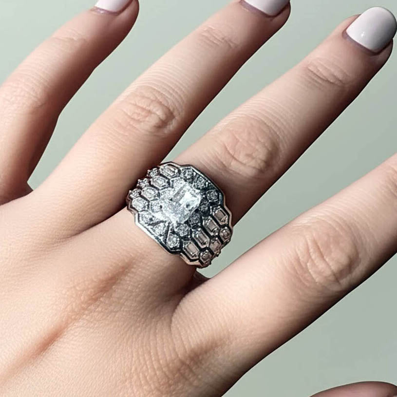 This elegant ring features a prominent square-cut cubic zirconia (CZ) as its centerpiece, beautifully surrounded by a dazzling pave setting of smaller CZ stones. Crafted from sterling silver, the band also showcases intricate pave detailing, enhancing its brilliance and luxurious appeal. It's a stunning piece that combines classic design with modern sparkle, perfect for an engagement or a statement accessory.
