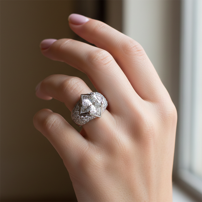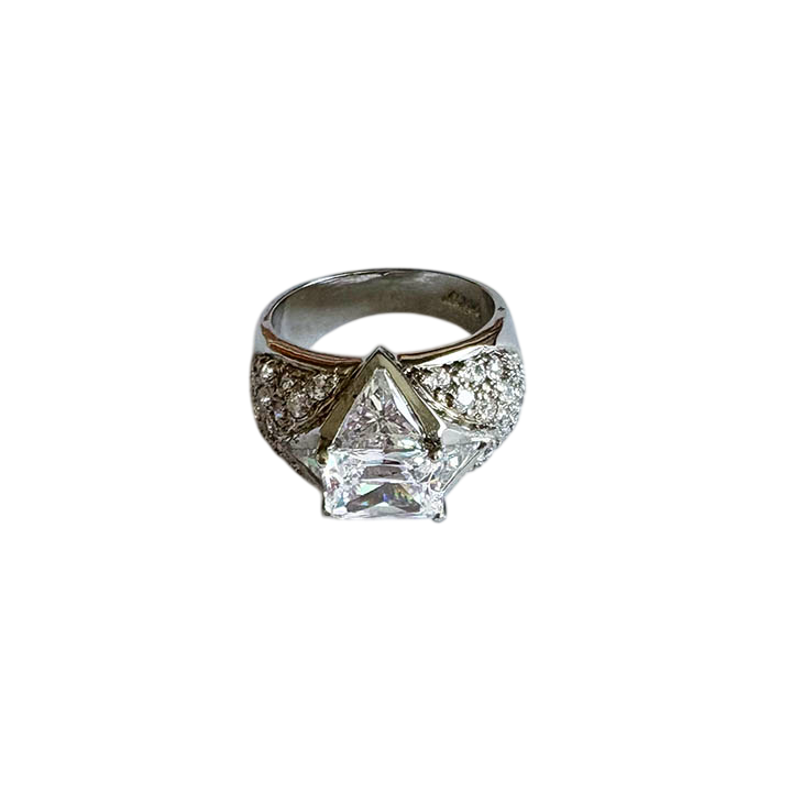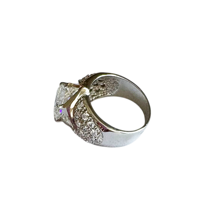 This eye-catching statement ring is crafted from high-quality .925 sterling silver and features a bold celestial design. At its center is a brilliant princess-cut clear premium cubic zirconia, encased in a striking star-shaped setting that maximizes its sparkle. The wide, tapered band is heavily embellished with a dense pavé of shimmering accents, creating a luxurious and radiant look. Perfect as a cocktail ring or a unique fashion piece, this ring combines modern geometric lines with timeless glamour.