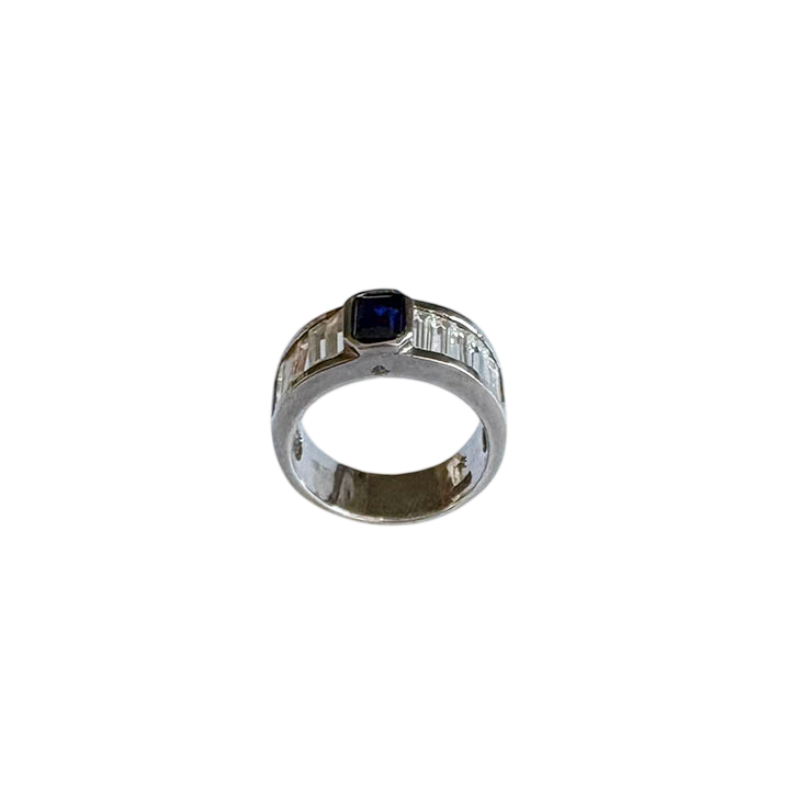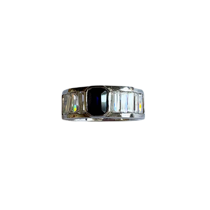 This sophisticated sterling silver ring features a bold, rectangular emerald-cut lab-created blue sapphire securely held in a polished bezel setting. The center stone is beautifully accented by a row of clear, baguette-cut side stones cubic zirconia that are elegantly channel-set into the wide, flat-top band.