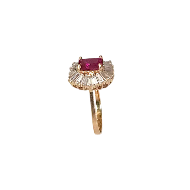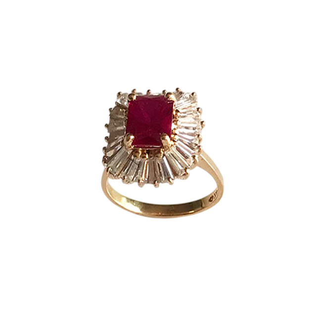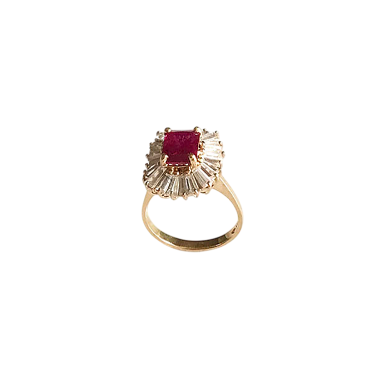 This stunning vintage ring features a vibrant, rectangular-cut red stone at its center, surrounded by a radiant cluster of baguette and round-cut stones. The intricate setting is crafted from 14K gold, showcasing a timeless and elegant design perfect for a special occasion or as a cherished heirloom.
