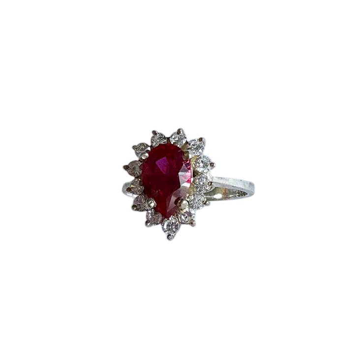 This elegant statement ring features a vibrant, pear-cut (teardrop) lap created color stone as its focal point, exuding a rich, deep crimson hue. The center stone is beautifully accented by a halo of sparkling clear stones Cubic Zirconia that enhance its brilliance and vintage-inspired silhouette. Crafted in high-quality 925 Sterling Silver, the band has a polished finish and a classic tapered design, making it a sophisticated choice for an anniversary, birthstone gift, or a romantic promise ring.