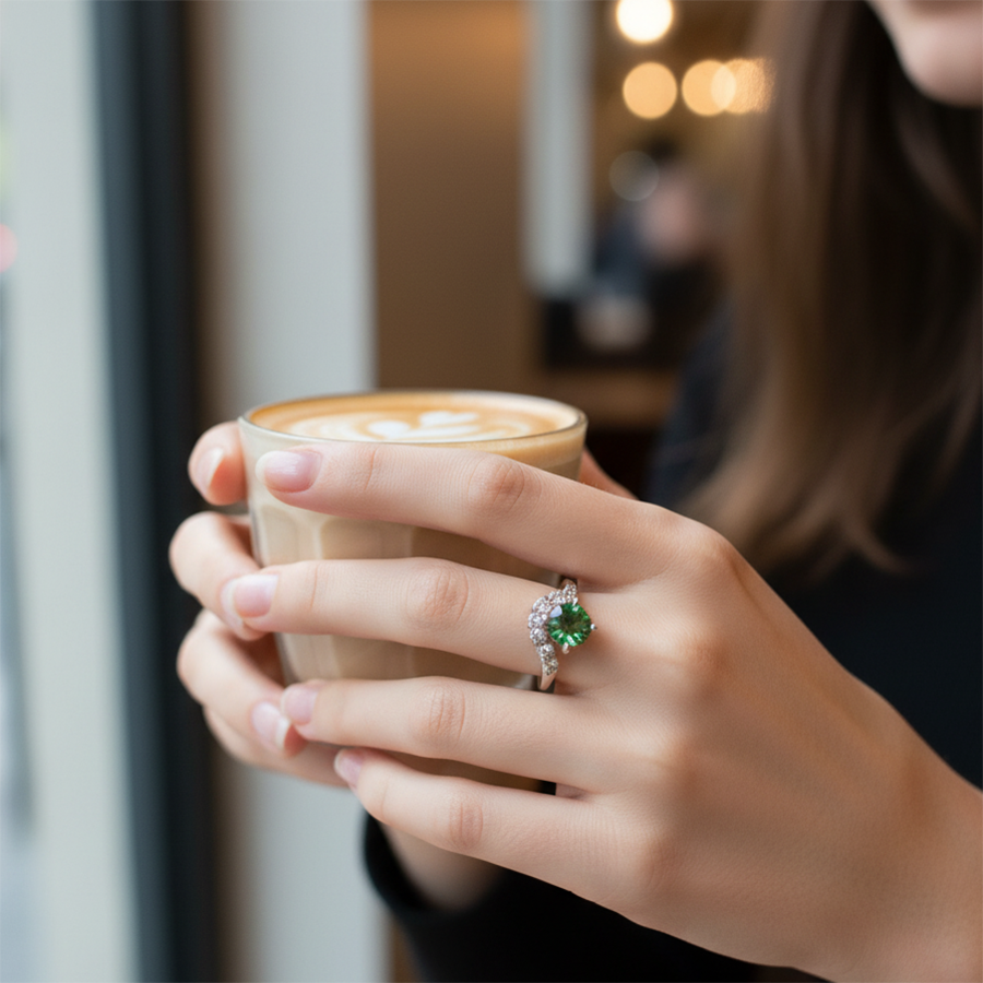 This elegant vintage sterling silver ring features a prominent round-cut green color stone, likely a tourmaline or peridot, set in a decorative, swirling design. The band is adorned with a row of smaller, sparkling stones, possibly cubic zirconia, enhancing its classic appeal. The silver shows a lovely patina, indicating its age and character.