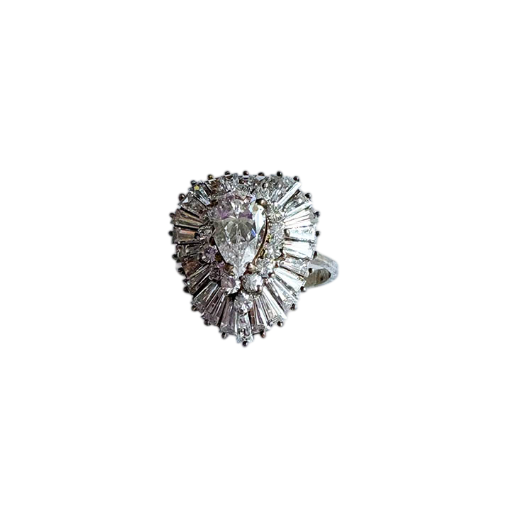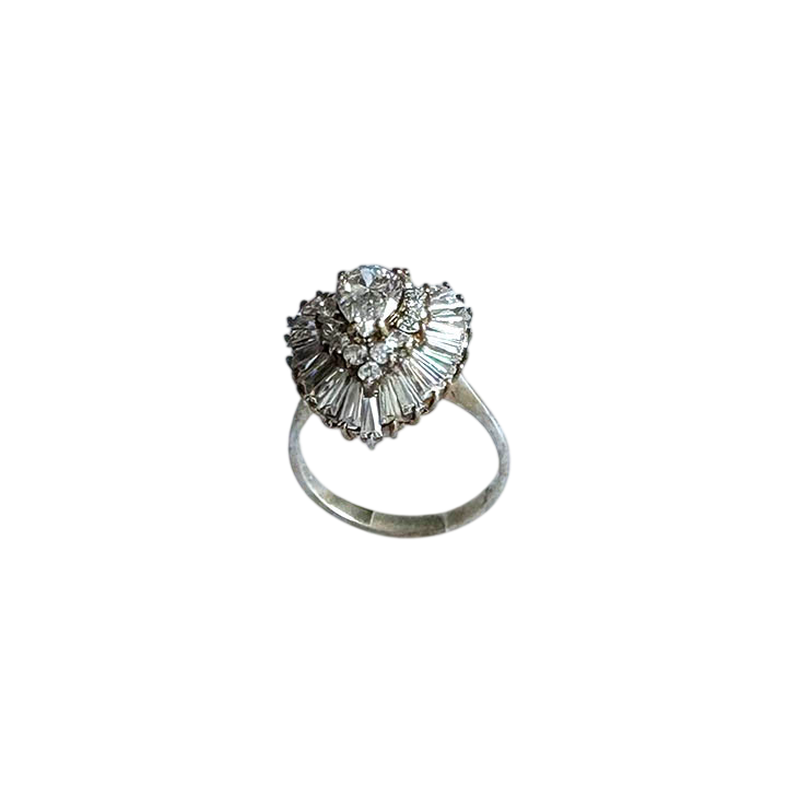 This elegant sterling silver ring features a classic "ballerina" style design, named for its resemblance to a ballerina’s tutu. At its center sits a brilliant pear-cut stone, which is framed by an undulating, sunburst-style halo of tapered baguette and round-cut accent stones.